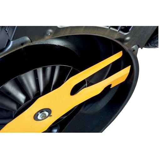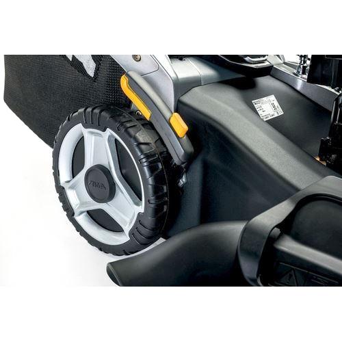 Модель оснащена мощным движком Briggs&Stratton 775 IS Series In Start с системой легкого запуска и низким уровнем шума. К достоинствам устройства можно отнести уменьшенное количество вредных выбросов. Газонокосилка собрана из комплектующих европейского производства, что значительно повышает ее качественные характеристики. Корпус сделан из прочной стали. Большие задние колеса делают модель более проходимой, а благодаря подшипникам обеспечивается плавный ход устройства. Предусмотрено четыре рабочих режима: сбор травы, задний и боковой выброс, мульчирование.